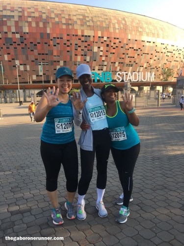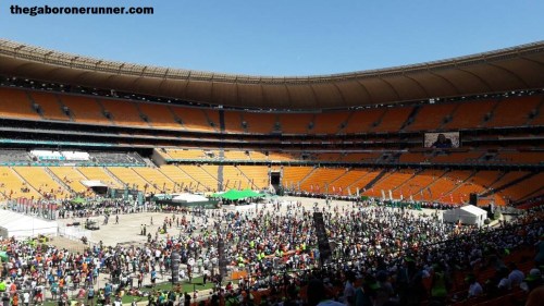 Race Morning: I was up at 04h00 and by 04h30 Tich, Ditiro and I were out of the house. We met Paul, Polelo and Elisa at our designated meeting spot and then in two cars drove to the FNB Stadium. As we approached the Stadium we were met with a very long queue…