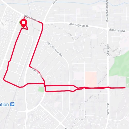 Once you come to the end of Botswana Road, cross Khama Crescent into the Government Enclave and make your way onto the Bus Station Flyover. Then turn right into the CBD and head straight towards The Three Dikgosi monument. Your run is done!