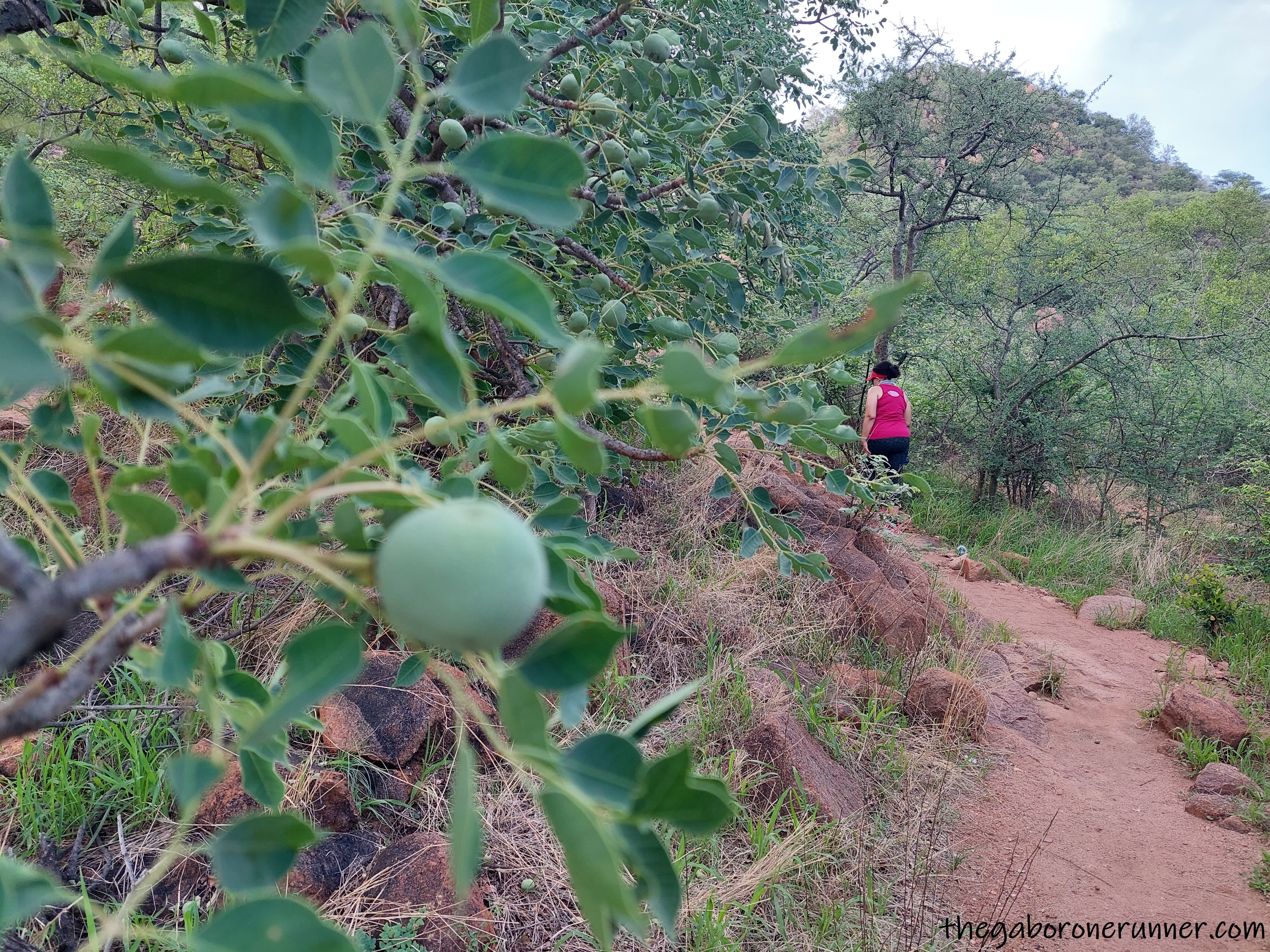 Once you’ve navigated the rocky section, you eventually make your way to a flat narrow trail and eroded gulley. The flatter terrain offers a welcome respite after the intense climb. You get to enjoy nature at it’s best, the occasional rustle in the bush, the moretologa fruits in the trees and the gorgeous blossoms of the Kalahari Christmas Tree at this time of year. There’s also a natural “pull-up apparatus” if you’re keen to do some pull ups on your way up the hill!